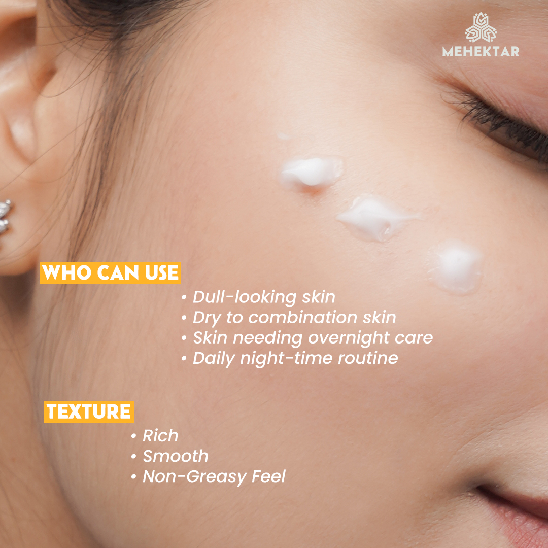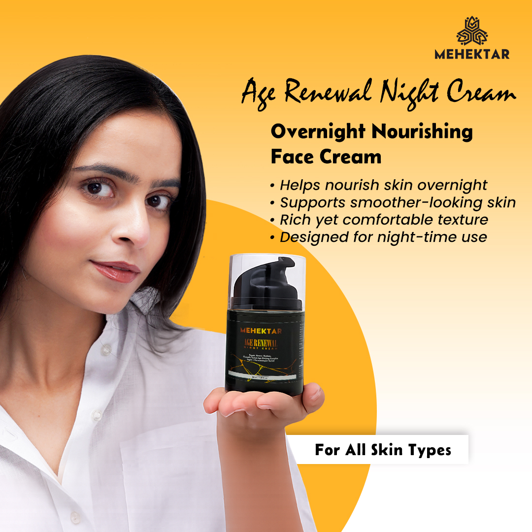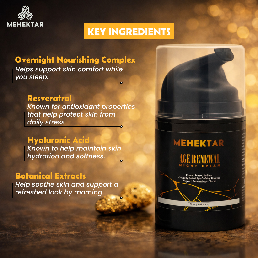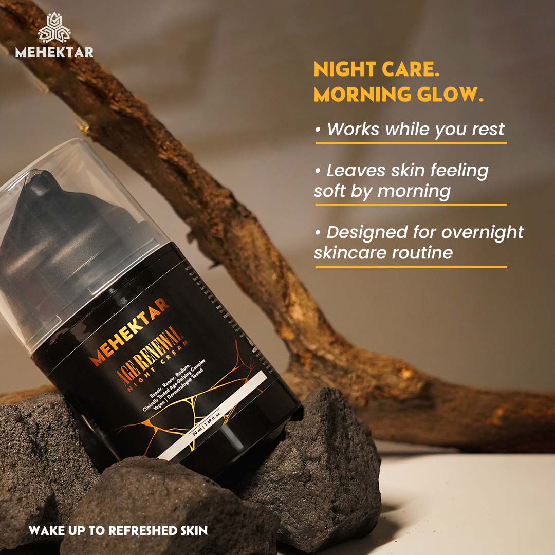 Mehektar Age Renewal Night Cream is a nourishing anti-aging night moisturiser powered by Retinol, Resveratrol, Alpha-Arbutin & Hyaluronic Acid to repair skin overnight.