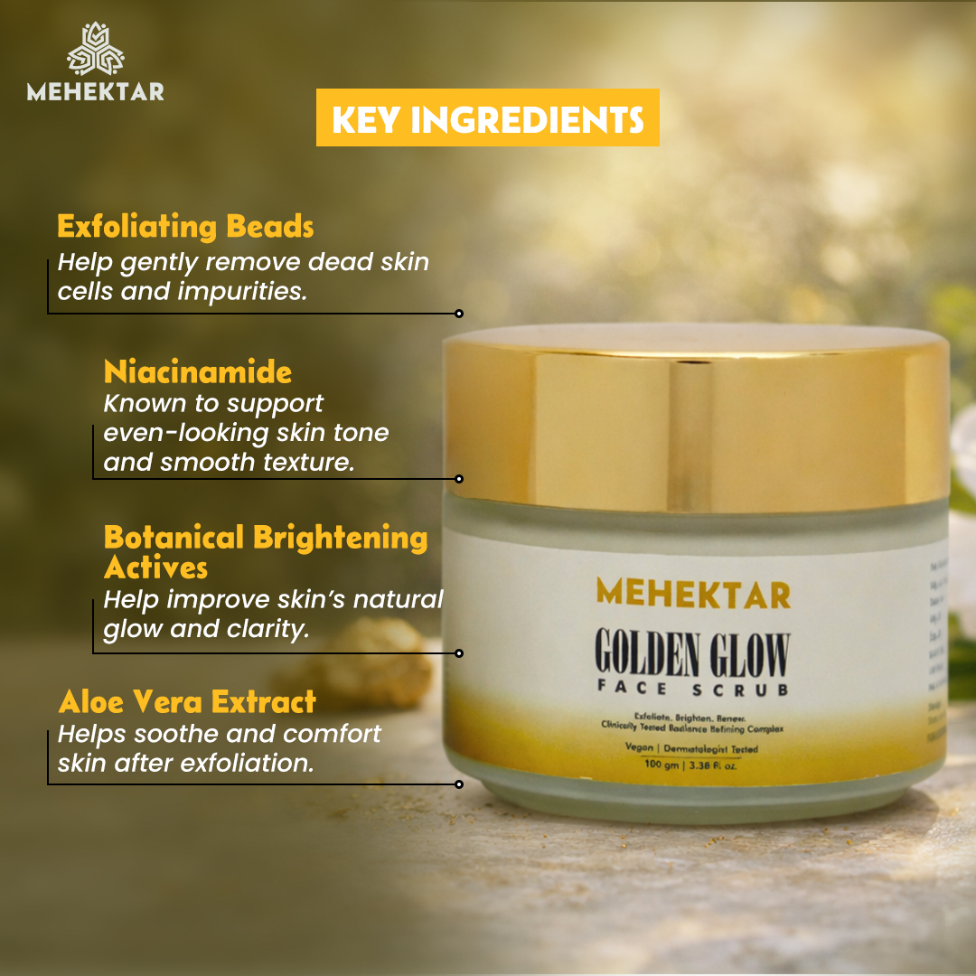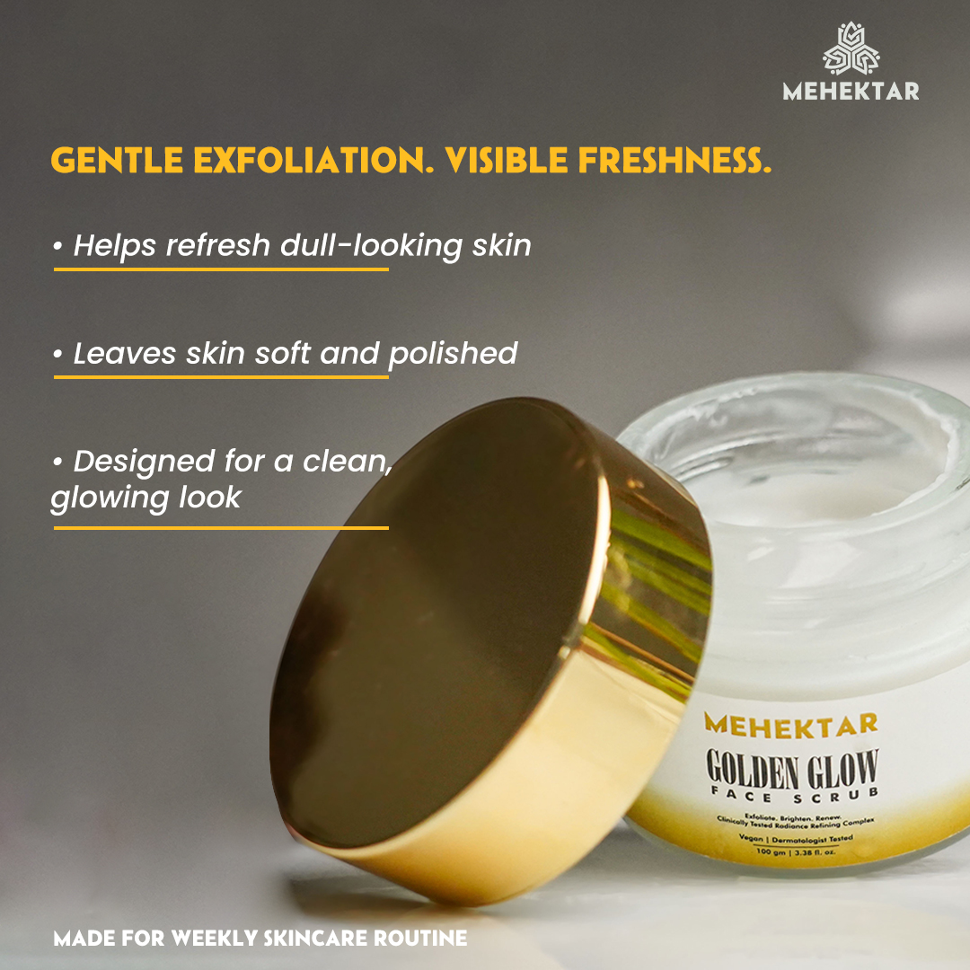 Mehektar Golden Glow Face Scrub is a gentle exfoliating face scrub designed to remove dead skin cells, polish dull skin and reveal a naturally bright glow.