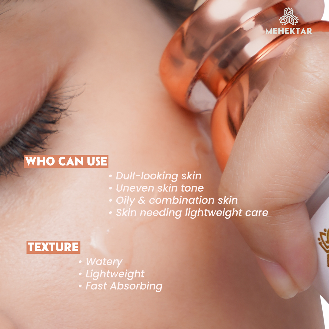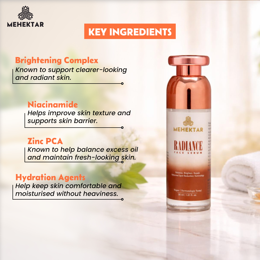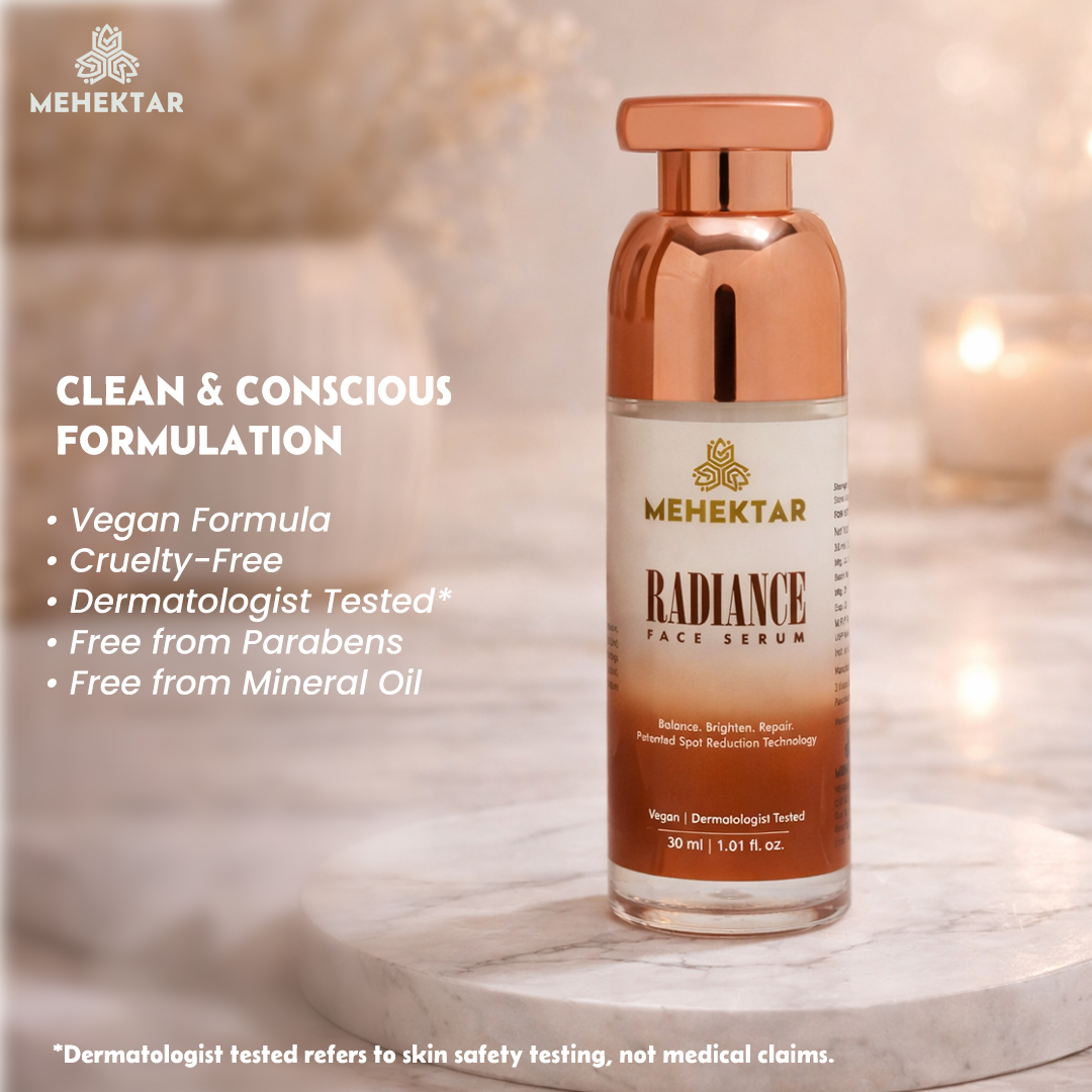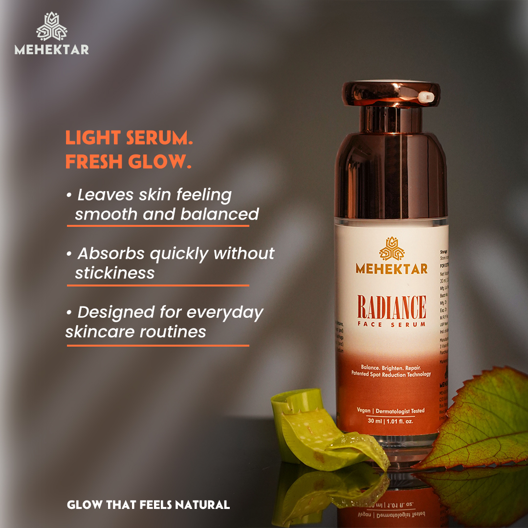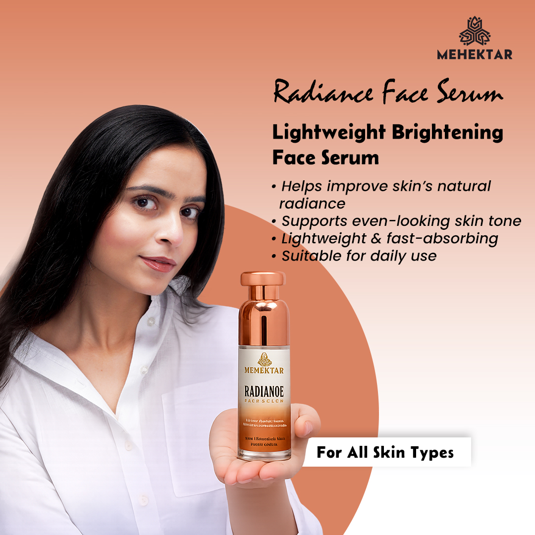 Mehektar Radiance Face Serum is a lightweight daily brightening serum formulated with Niacinamide, Zinc PCA & Botanical Extracts to improve skin clarity, reduce dark spots and refine visible pores.